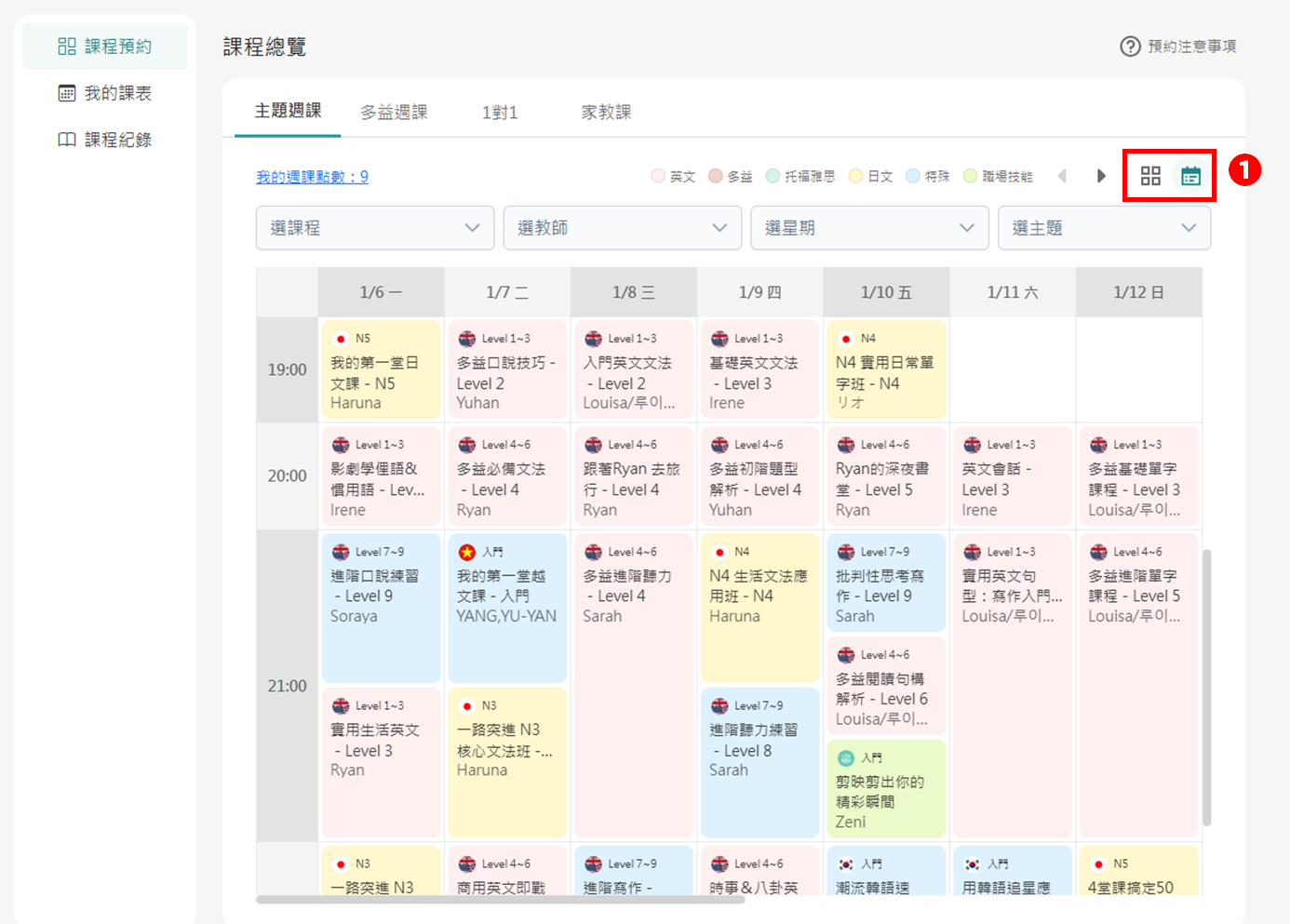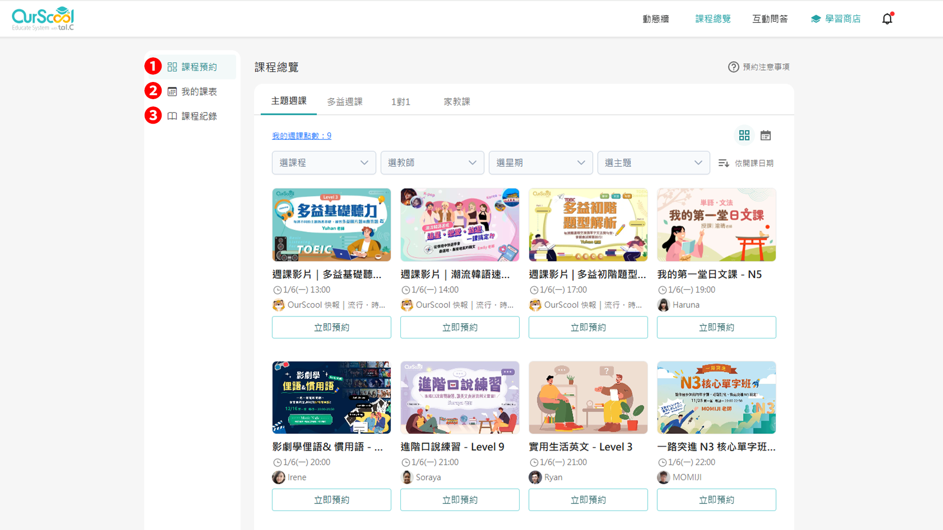 ➊ **課程預約：**&#x67E5;看平台中所有課程，包含主題週課、一對一、家教課，可從此頁面預約及取消課程。