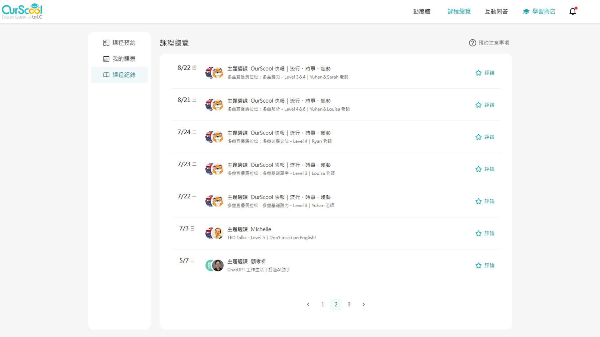 ➌ **課程紀錄：**&#x67E5;看過去所有預約的課程紀錄，可從此頁面下載教材、影片並進行教師評論。