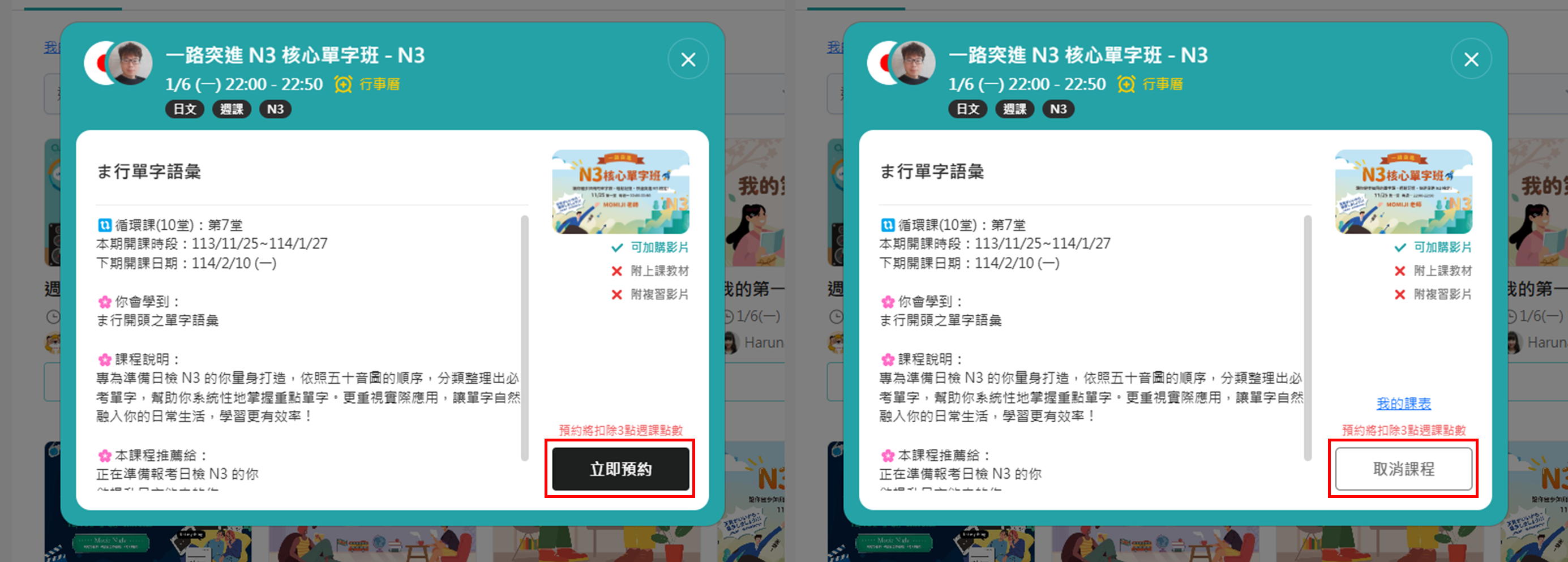 1. 預約跟取消，一鍵搞定：在課程介紹的畫面中，不只預約課程，也可以從此畫面直接取消課程哦！